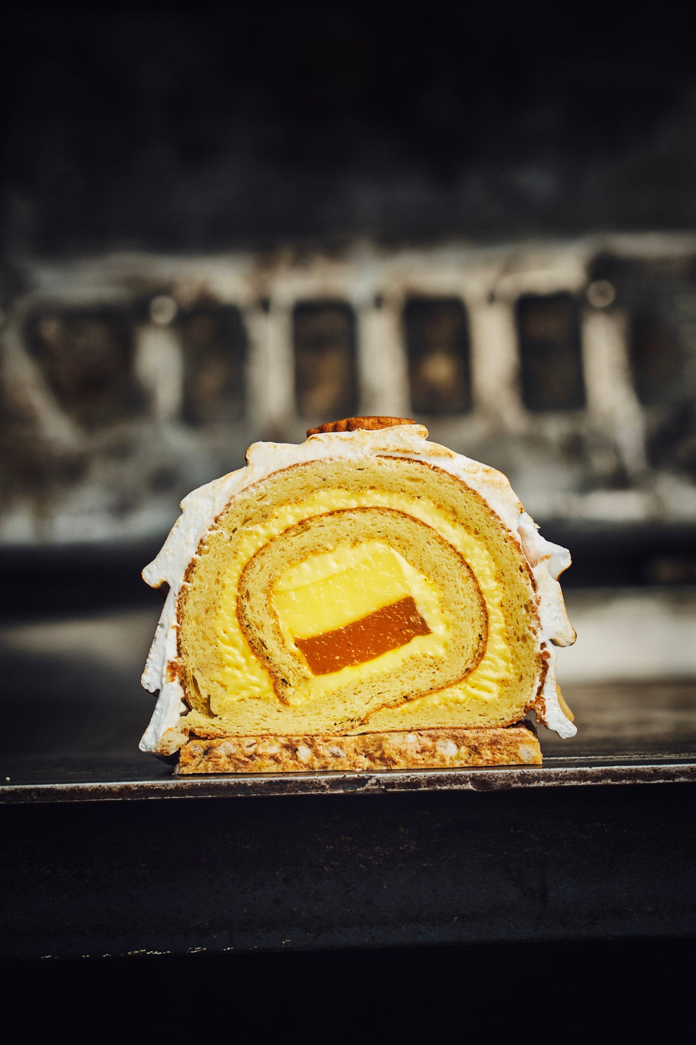 Un biscuit roulé ultra moelleux à la vanille, un croustillant coco riz soufflé, une compotée manque passion, un crémeux citron, une mousse mangue passion légère et aérienne.