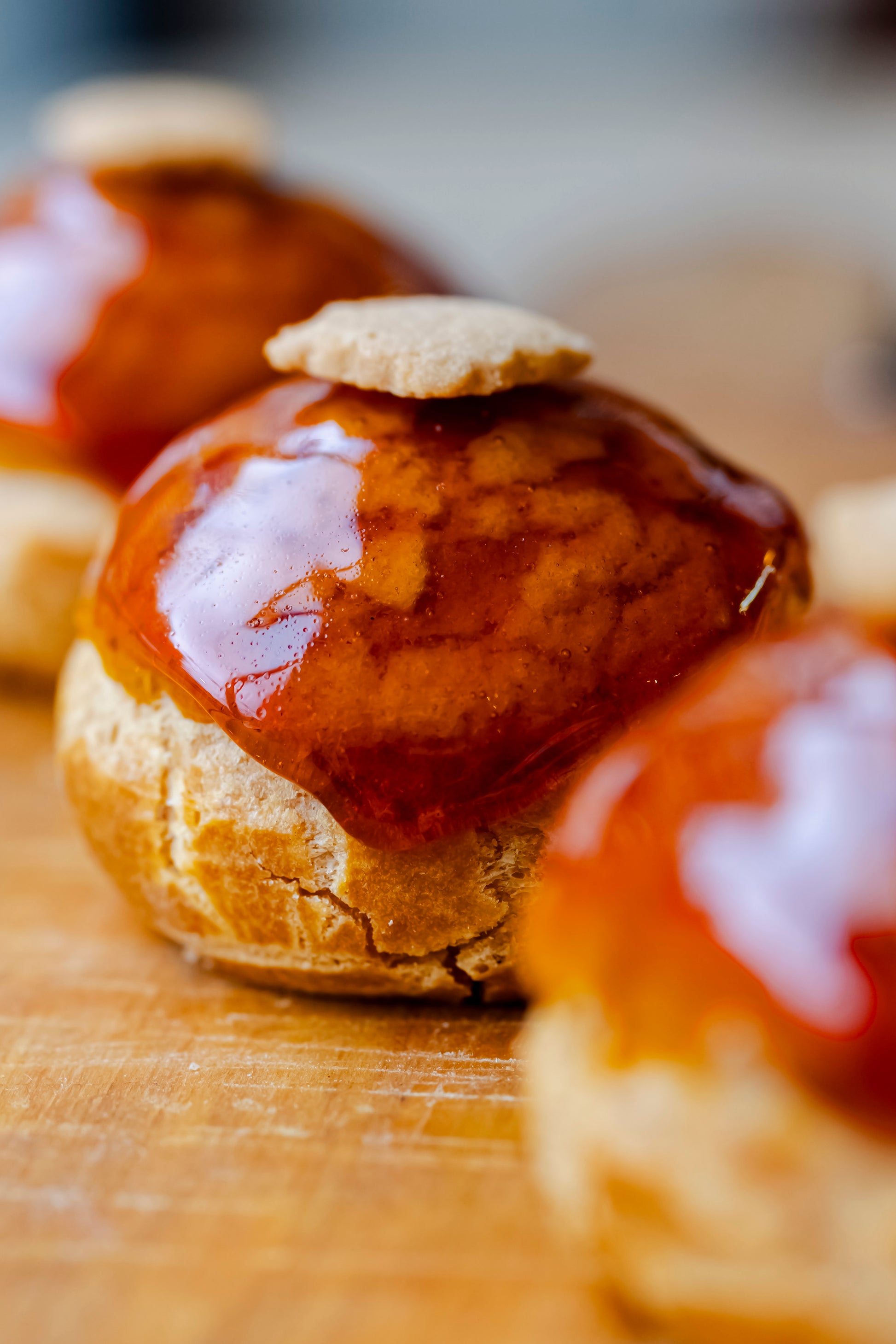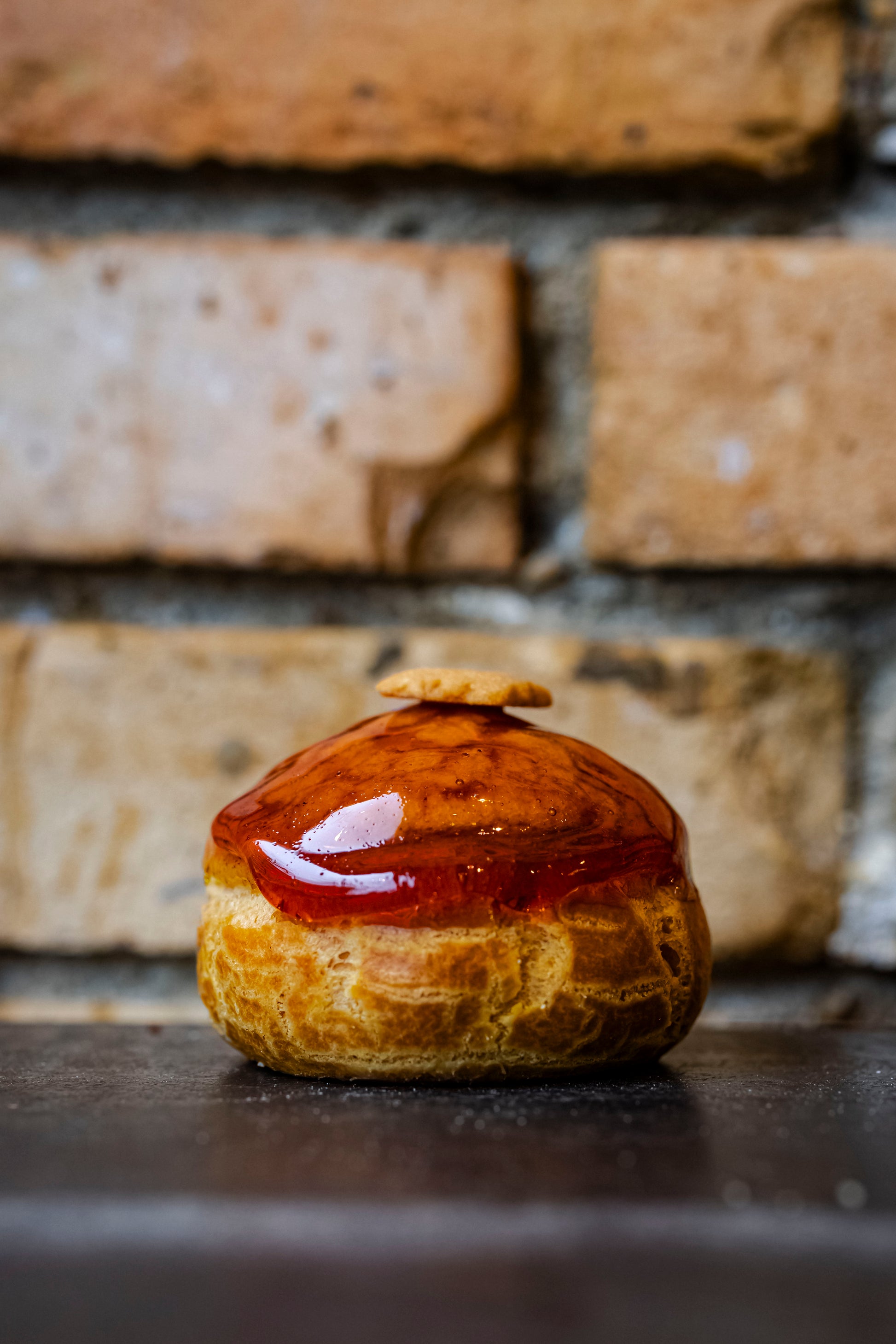Un chou généreux garni d’une crème pâtissière au Kirsch « Grande Réserve », relevée par un caramel croquant : attention ça décoiffe !